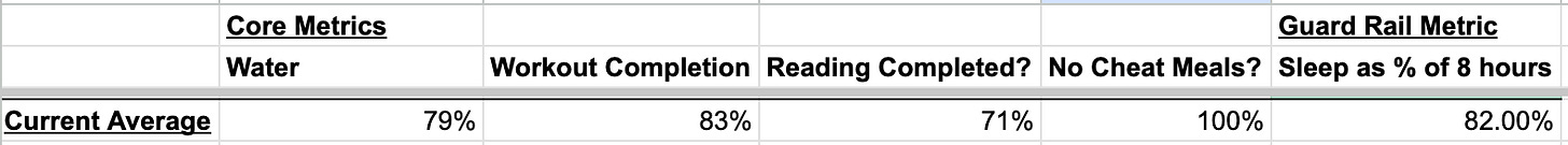 Below I’ve measured the success rate for each of the following based on my completion rate (i.e. completion of drinking gallon of water is either 0% or 100%, workout is 50% done if one workout completed and 100% if two are, etc.):